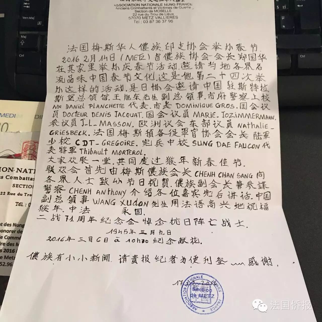 本报讯:2016年 2月14日,(METZ)省侬族协会会长郑国华在家里举办庆春节活动,并邀请当地各界名流品味中国春节文化。这可是他第24次举办春节庆祝活动了! 中国驻斯特拉斯堡总领馆副总领事王旭东、市府警察上校 DANIEL PLANCHETTE 代表市长DOMINIQUE GROS、国会议员DOCTEUR DENIS JACQUAT、国会议员Marie-Jo Zimmermann, 参议员J-L-MASSON、欧洲议会东部议员NATHALIE GRIESBECK,法国梅斯预备役军官协会会长陆军少校CDT-GREGOIRE,宪兵中校SUNG DAE FAUCON代表将军THIBAULT MORTEROL等出席了本次活动。 大家欢聚一堂,共庆猴年新春。 联欢会上,梅斯侬族会长郑国华 CHENH CHAN SANG 向各界人士致以节日祝贺!侬族副会长兼参谋警察 CHENH ANTHONY 邀请各位嘉宾先后发言。中国驻斯特拉斯堡总领事馆副总领事王旭东先生用法语向来宾拜年,同时祝中法关系永固! 另外,最近该协会即将举办的活动有: (活动)二战71(1945-2016)周年纪念会悼念抗日阵亡战士。活动时间:2016年三月六日上午10点20分纪念、鲜花。欢迎大家参加! (该协会联系方式:22 rue du Trou de Lieve 57070 METZ VALLIERS联系电话:03 87 36 37 96/06 52 96 15 14) 编后语: 这是一种怎样的情怀? 一位从东南亚移民来法国的老华侨,尽管因为不在巴黎,自己也退休多年,无法做出大规模的思念故乡庆祝春节活动,但是,他尽自己所能,在自己家里每一年举办庆祝中国春节活动! 因为离巴黎太远,考虑经济等方方面面的原因,我们无法去现场参加采访报道。为此,我心生内疚。 让我感动的是,每一次活动后,郑先生都会洗好照片,一字一句用繁体字写好报道,再邮寄到《法国侨报》! 尽管,我们需要一个字一个字打出来,有时候因为字迹不清楚,需要大家一起研究讨论。是比较麻烦。 但是,一个异国他乡老华侨的爱国情怀,深深感动着我们每一个人! 我们会在爱和感动中,敲打一个个字……感谢您!郑先生!衷心祝贺您和您的家人新年快乐、心想事成! 图片集锦: |