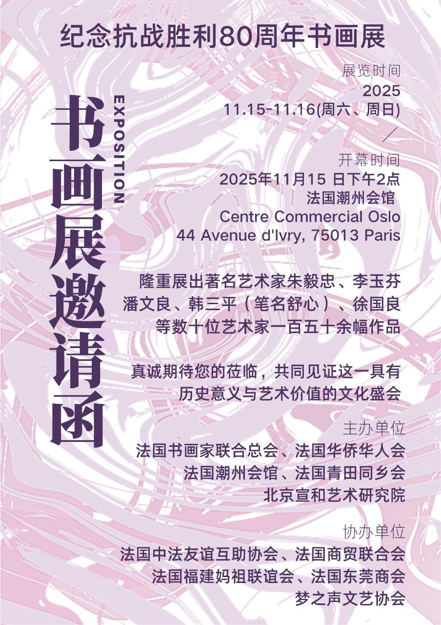 《法国侨报》讯:(特约文字记者 刘平 视频 李玉芬)2025年11月15日至16日,纪念抗战胜利和反法西斯战争胜利80周年书画交流展将在法国潮州会馆隆重举行。这是记者从法国书画家联合总会于10月11日召开的第二次展览筹备会议上获悉的。本次展览将由法国书画家联合总会、法国华侨华人会、法国潮州会馆、法国青田同乡会及北京宣和艺术研究院联合主办,并由法国中法友谊互助协会、法国商贸联合会、法国福建妈祖联谊会、法国东莞商会及梦之声文艺协会共同协办。 为纪念中国人民抗日战争暨世界反法西斯战争胜利80周年,弘扬和平精神和中华优秀传统文化,促进中法两国艺术与文化交流,法国书画家联合总会积极筹备此次活动。10月11日举行的第二次筹备会上,会长留冠言携协会主要骨干成员,就展会推广、布展设计、作品甄选、来宾接待以及时间安排等各项细节进行了充分讨论,确保展览筹备工作有序推进。 据介绍,本次书画展为法国书画家联合总会组织举办的第五次大型展览,规模宏大、阵容强大,将汇集中法两国书画艺术家的精品力作。展览将展出包括著名艺术家朱毅中、李玉芬、潘文良、韩三平(笔名舒心)、徐国良等在内的数十位中国艺术家创作的一百五十余幅书画作品,涵盖书法、油画、国画、山水、花鸟等多个艺术门类,风格多样、意境深远。 展览将于2025年11月15日(星期六)下午14时举行开幕仪式,届时来自中法两国的艺术家代表、侨团负责人及各界嘉宾将出席,共同见证这一文化盛事。主办方表示,希望通过艺术的形式铭记历史、传递友谊与和平,展示中华文化的艺术魅力与精神力量。 据悉,本次书画展将面向公众免费开放,欢迎广大艺术爱好者、侨胞及市民前来参观,共同感受艺术的力量与和平的呼声。展览期间还将举办艺术交流活动,搭建中法艺术界互学互鉴的平台,进一步深化两国民间文化交流与友好情谊。 展览信息一览: 主题: 纪念抗战胜利和反法西斯战争胜利80周年书画交流展 时间: 2025年11月15日(星期六)至16日(星期日) 开幕式: 11月15日(星期六)14:00 地点: 法国潮州会馆(Centre Commercial Oslo, 44 Av. d’Ivry, 75013 Paris) 开放形式: 免费向公众开放 推广 |