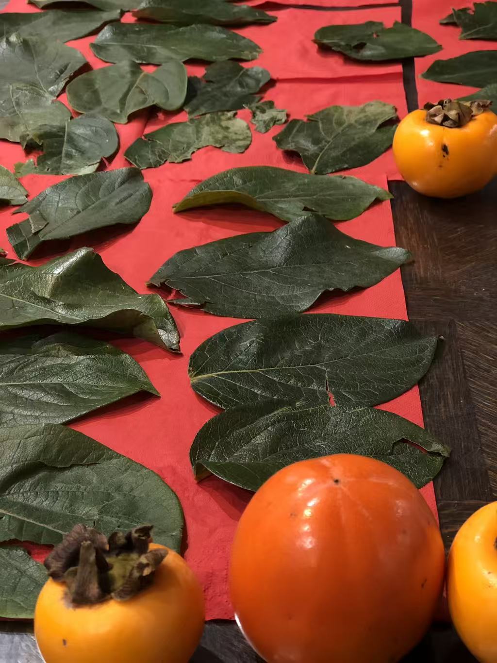 我赶紧问:黄了没有?她说两周前去还是碧绿的。我请燕子会长赶紧打电话给租客,去看看,我马上去摘。 燕子姐让租客拍照来一看,全部都掉光了,只剩几个金黄色的柿子高挂树上了。燕子姐让租客去附近的柿子树偷摘一些…… 电话里,我听到租客先生稍微迟疑了一下,说:我有一些速冻的绿色柿子叶。你来拿吧?等我们赶到租客那里,租客先生拿出一包速冻的绿叶…… 我的天啊!巴黎真的还有绿叶!!!从租客拍来光秃秃的照片,到燕子会长一句当我捧着那一包冰箱里保存得鲜绿如夏的叶子时,我真心觉得:巴黎深秋里,有人替我把春天留住了。 回家后,我和小钱像对待宝贝一样,一洗一擦、小心烘干:一片片柿子叶被我们摆满桌面,绿得柔亮,绿得安静,仿佛在巴黎的寒意里,为我悄悄点亮一盏暖色的小灯。