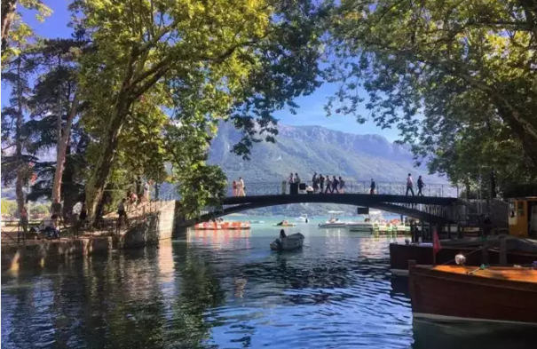 在安纳西湖畔,大家还来到著名的卢梭爱情桥(Pont des Amours)。相传18世纪法国思想家卢梭曾在这里漫步沉思,这座横跨湖畔运河的小桥因此被赋予了浪漫的象征意义。桥畔绿树掩映,湖水澄澈,远山如黛,是安纳西最富诗意的景点之一。大家纷纷驻足拍照留念,在这座象征爱情与美好的桥上记录下属于这个春天的欢乐瞬间。