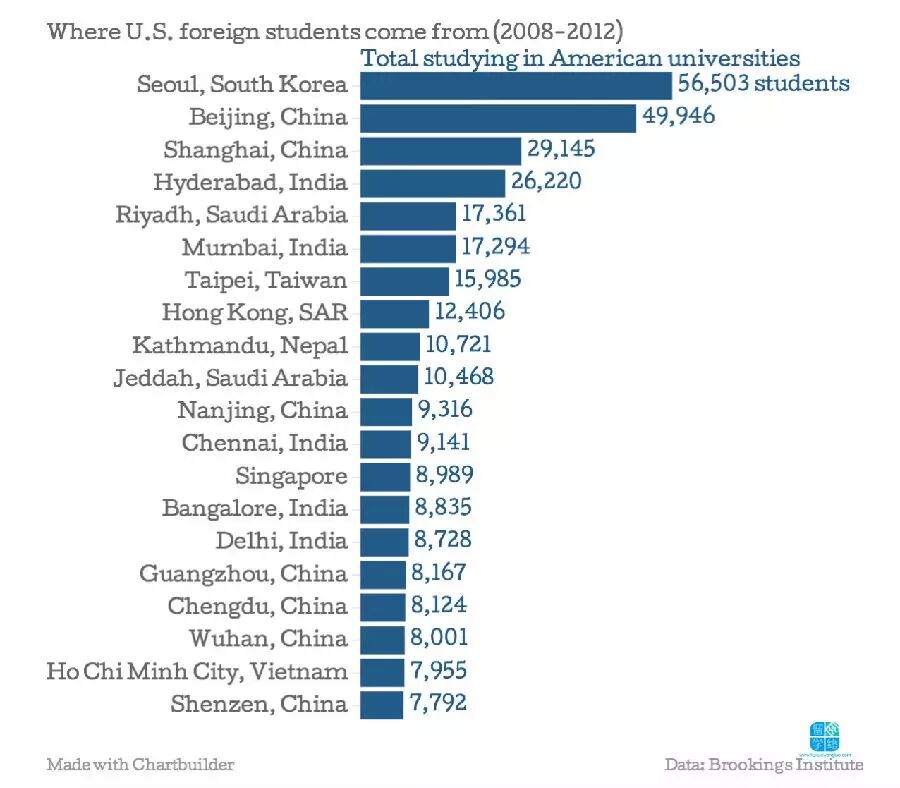 以城市为单位统计,自韩国首尔的留学生最多,超过了5万6千名,他们在美国读本科、研究生及博士学位。北京是美帝留学生的第二大生源地,2008到2012年间,一共有将近5万名学生。上海是第三大生源地,有3万名留学生。第四大生源地,则是印度的海得拉巴Hyderabad,有2万6千名留学生。