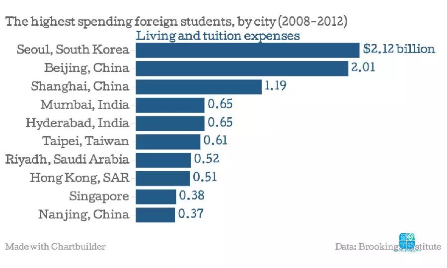 从2008到2013年的数据显示,留学生一共支付了220亿美元的学费,130亿美元的生活费用。韩国首尔的留学生数量多,而且花费最大,其次是北京、上海及印度孟买。