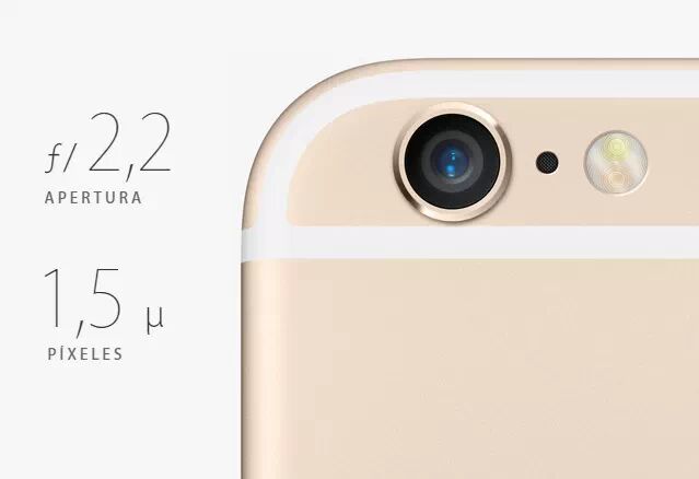 使用了800万像素外凸式iSight摄像头,全新的Focus Pixels可以让新款的iPhone6/6 Plus更快速的实现对焦。闪光灯为圆形“TrueTone”双LED闪光灯。但是并未在像素数量上进行提升,其单个像素尺寸也仍为和iPhone5s一样的1.5微米、f/2.2光圈,6 Plus的特点是搭载了光学图像防抖功能。