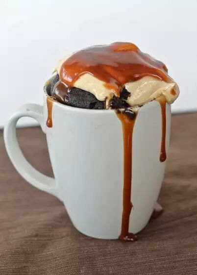 将黄油和花生酱、香草、鸡蛋、糖混合均匀,加入面粉,可可粉,盐和泡打粉拌匀后倒入杯子。将焦糖块混入面糊中,倒入杯中,放入微波炉烤3分钟即可