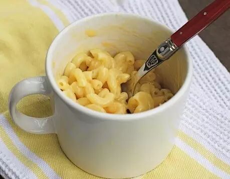 按照说明用盐水把通心粉煮熟,将通心粉、奶酪、牛奶、适量的水放入杯中,微波炉加热4分钟即可