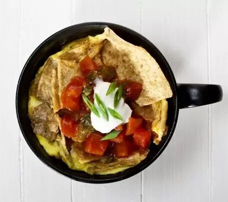将鸡蛋、牛奶、盐、黑胡椒搅匀后倒入杯中,加入奶酪、玉米片、辣酱搅匀。放入微波炉加热70秒取出,用玉米片、酸奶油装饰即可