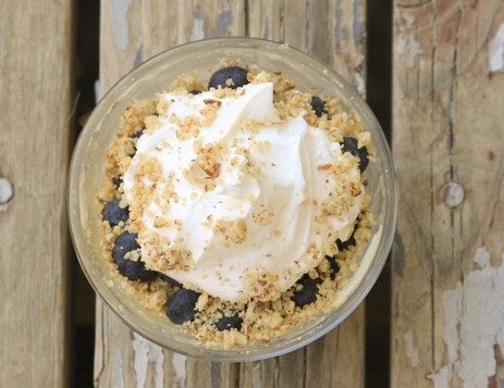 蓝莓1盎司、磨碎的亚麻籽4杯、泡打粉2茶匙、无糖糖浆2汤匙、橙皮2茶匙、蛋清1个、豆蔻粉2茶匙