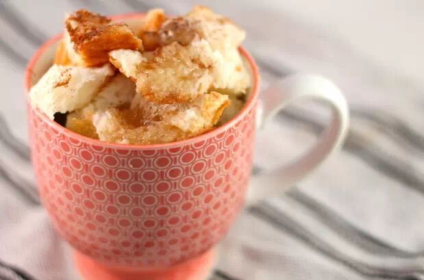 将法国吐司切成小丁备用,把黄油放入咖啡杯中融化,均匀擦在咖啡杯内壁上。加入鸡蛋、牛奶、桂皮粉混匀,放入吐司丁泡1分钟后用微波炉加热80秒。取出后淋上糖浆即可