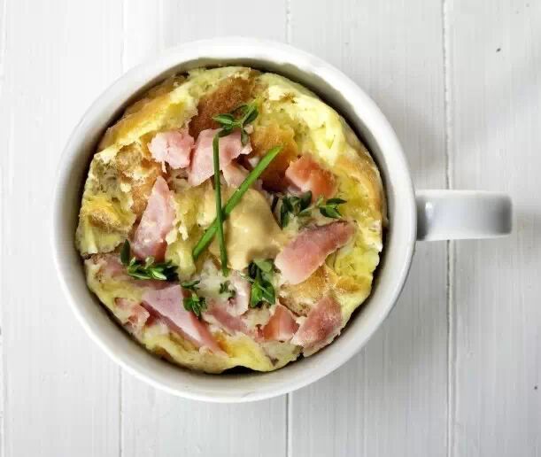 将鸡蛋、牛奶、盐、胡椒搅匀后倒入咖啡杯中,加入撕成硬币大小的面包、奶油奶酪、火腿丁,撒上百里香。用微波炉加热70秒,撒上第戎芥末和葱末装饰