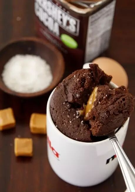 2块焦糖块,2茶匙香草、鸡蛋1个、2汤匙糖、2汤匙面粉、3汤匙可可粉、8茶匙盐、8茶匙泡打粉