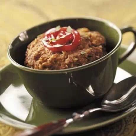 将牛奶、番茄酱、燕麦在碗中拌匀,加入牛肉末、洋葱末,再次搅匀,倒入咖啡杯中,微波炉加热3分钟,取出后淋上番茄酱即可