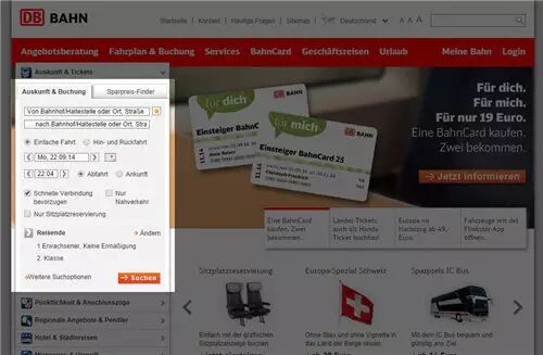 在www.bahn.de首页输入出发(von)和到达(nach)的城市、时间、人数(Reisende那里点Ändern来添加人数)。点击“suchen”开始搜索。