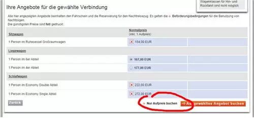 点了刚才说的按钮后,会见到下图页面。此时,一定要点红圈中的”Nur Aufpreis buchen“!!!这样就进入了订位流程而不是买票流程。