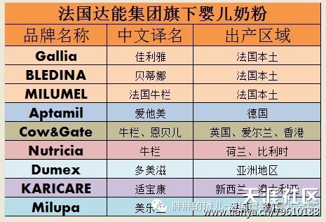 法国达能集团是一个跨国经营的多元化公司,旗下的婴儿奶粉,因生产区域不同而有不同的品牌名称。由法国达能集团统一授权、控股并生产的婴儿奶粉如下: