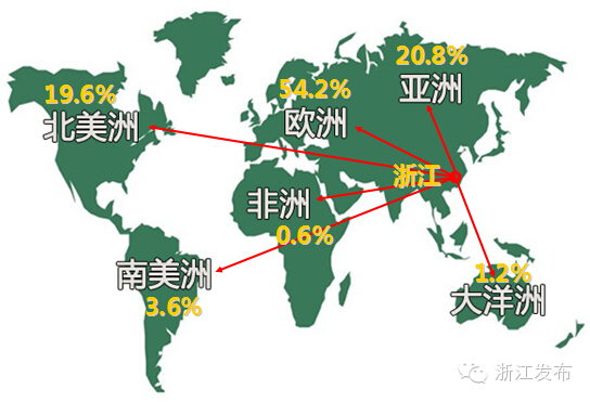 浙江籍海外华侨华人、港澳同胞分布在世界180个国家(地区)。从全球分布状况来看,以欧洲居多,占54.2%;亚洲其次,占20.8%;北美洲居第三,占19.6%;南美洲、大洋洲和非洲的人数较少,仅占3.6%、1.2%和0.6%。