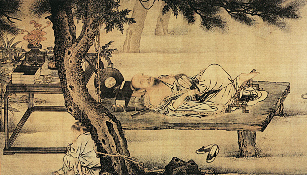 这厮在睡觉,可瞧他旁边的乐器和法帖