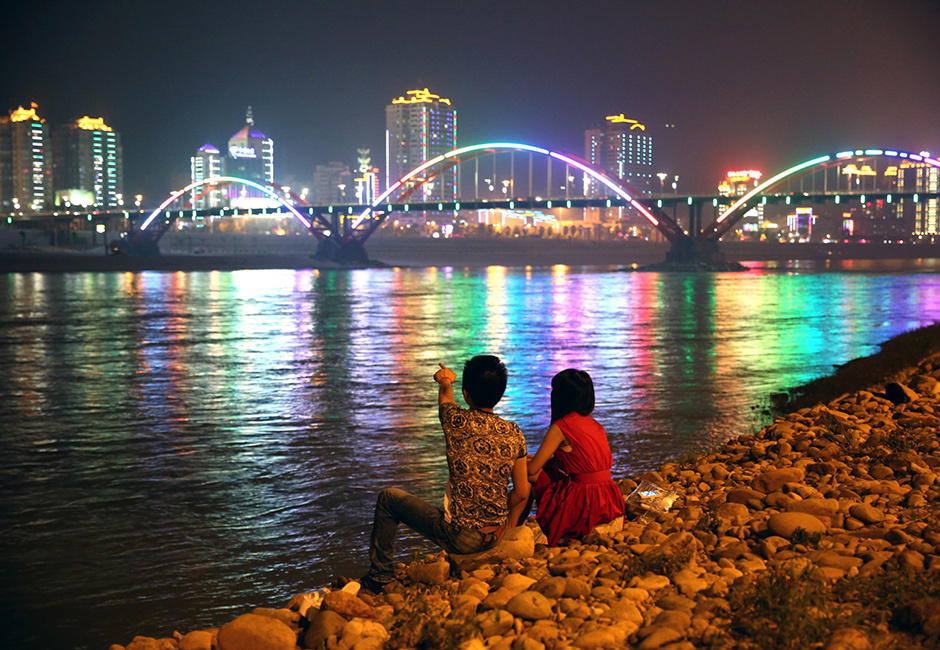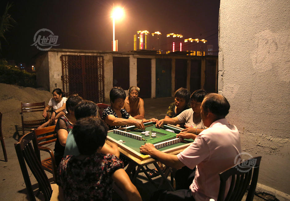 夜晚,微弱的灯光下,青田当地人坐在江边打麻将。远处亮着霓虹灯的楼盘,每平米超过了2万元。