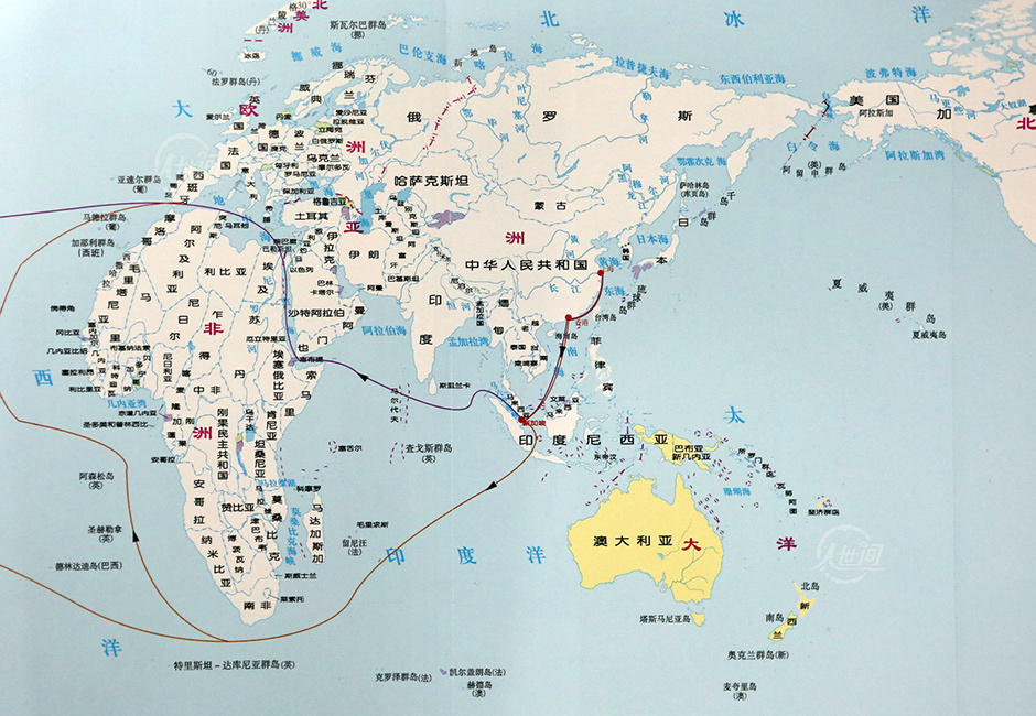 青田早期华侨出国路海上路线图。据1935年英文版《中国年鉴》记载,早在十七、十八世纪之交,少数中国人循陆路经西伯利亚前往欧洲经商,以浙江青田籍人为多,贩卖青田石为主。