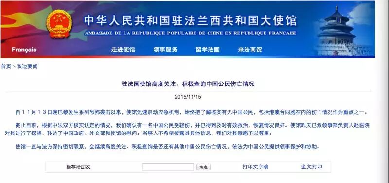 本期报道和节目由《欧洲华语广播电台》、《法国侨报 》、《法国侨网》联合报道:自11月13日晚巴黎发生系列恐怖袭击以来,使馆迅速启动应急机制,始终把了解核实有无中国公民,包括港澳台同胞在内的伤亡情况作为重点之一。