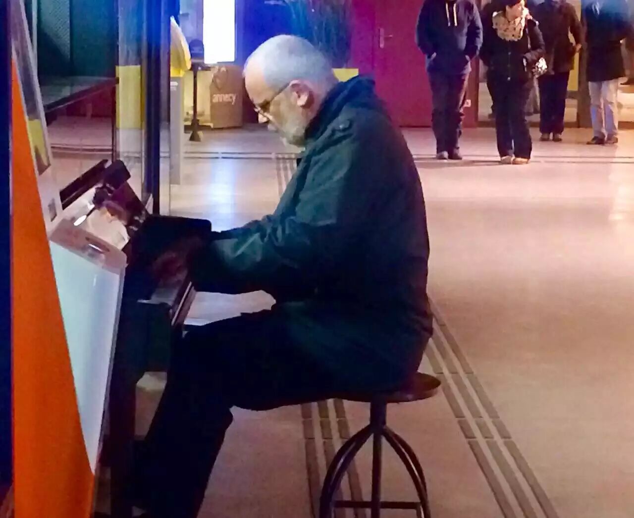 法国南部城市Annecy火车站大堂旁边有一具公用钢琴,钢琴上写着:“C'est à vous de jouer!— 请随便玩!”一位过路的旅人,陶醉在忘我的演奏中,大堂内扬起了悦耳的钢琴声,和一阵阵围观者的掌声!发图的朋友认为,此举给美丽温馨的圣诞节带来与众不同的真真实实的快乐!