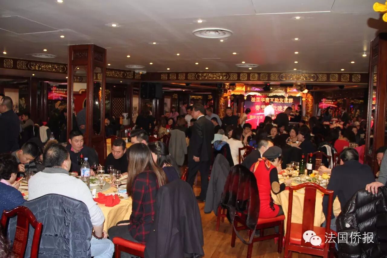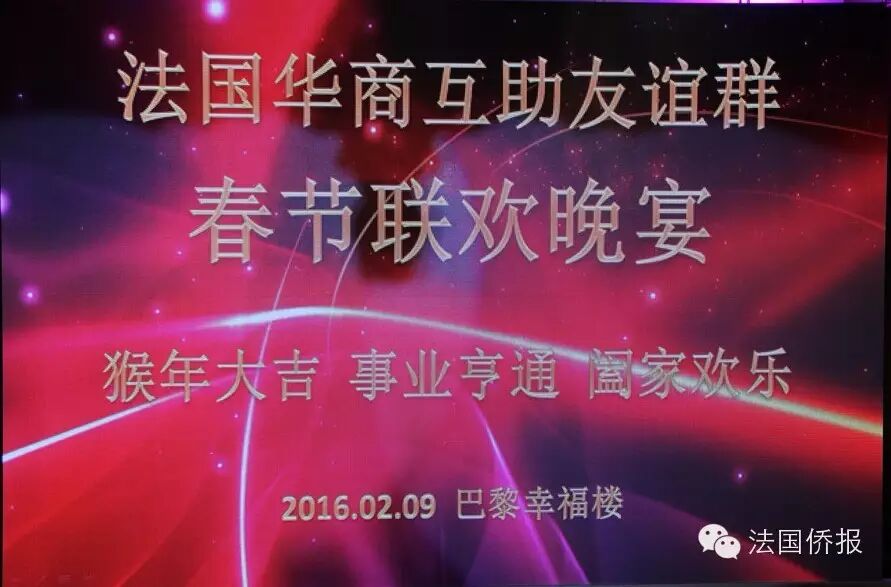 (本报讯:实习记者 邹於鑫)2016年2月9日晚,法国华商互助友谊群在巴黎举行春节联欢晚宴,旅法华侨华人共300余人参加了本次晚宴。