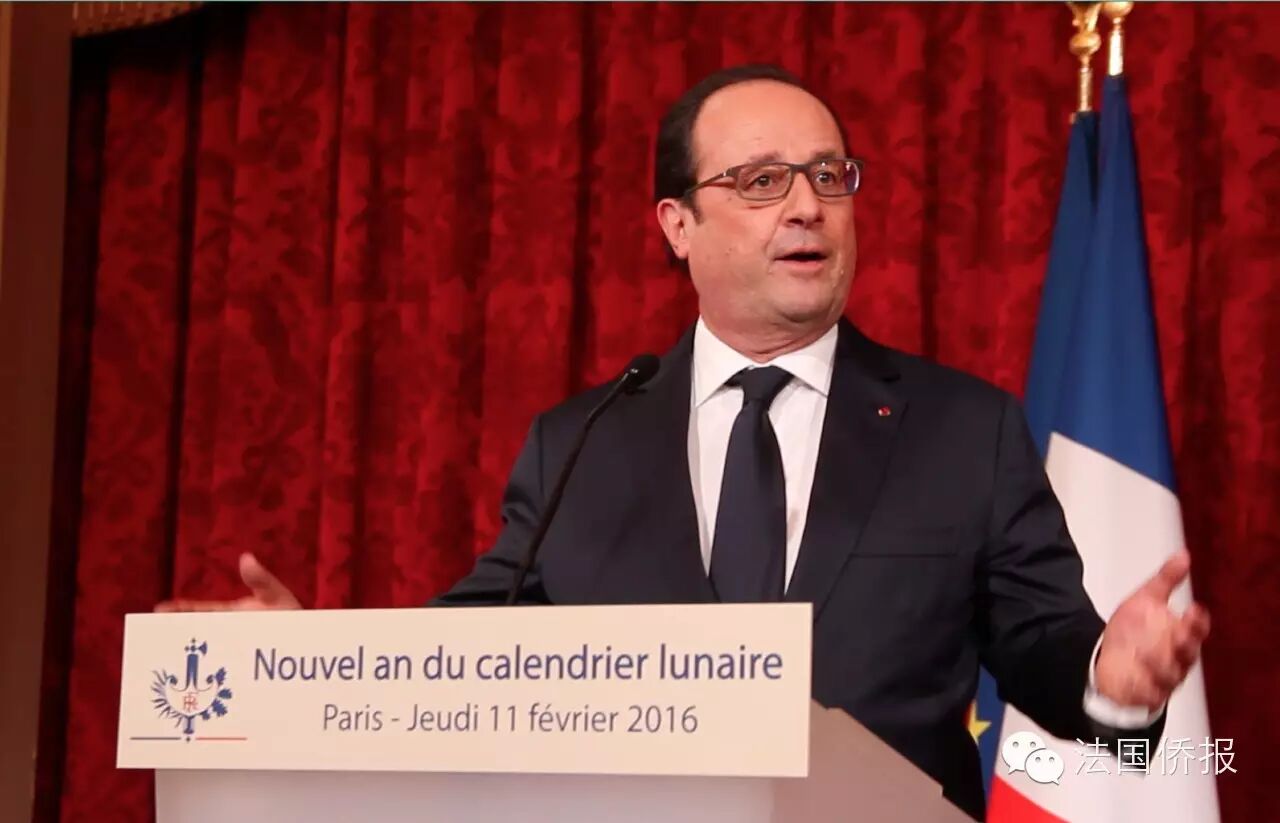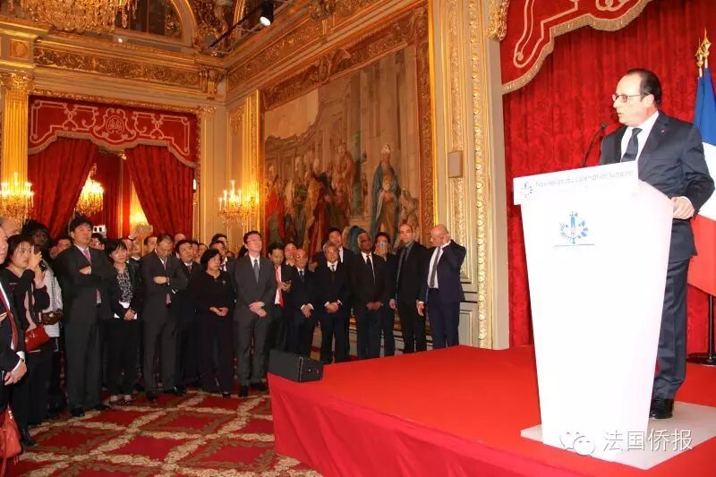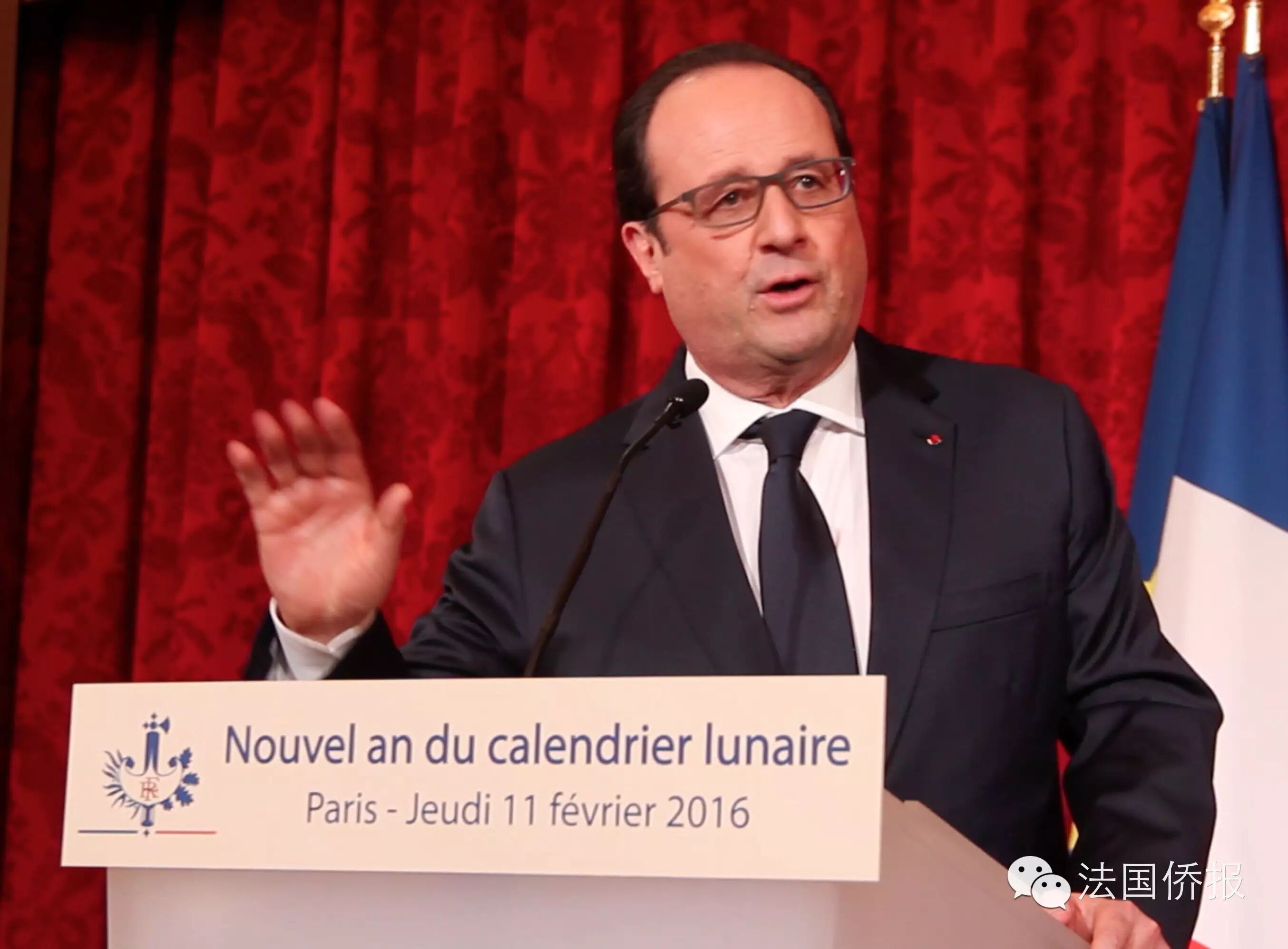 奥朗德总统首先为在场的嘉宾送上新春的祝福。他在致辞中表示,在法国过春节已经变成一个传统,经过亚裔社群的努力,中国春节已经从亚裔的节日发展成法国人民的节日,成为与亚洲人民共享的节日。今年的春节具有特殊背景,法国在去年11月13日遭遇恐怖袭击之后,法国国家处于紧急状态,但是我们的生活应该继续,也应该庆祝节日,即将举行的巴黎13区春节游行等庆祝中国新年的活动是大家分享幸福快乐的方式。