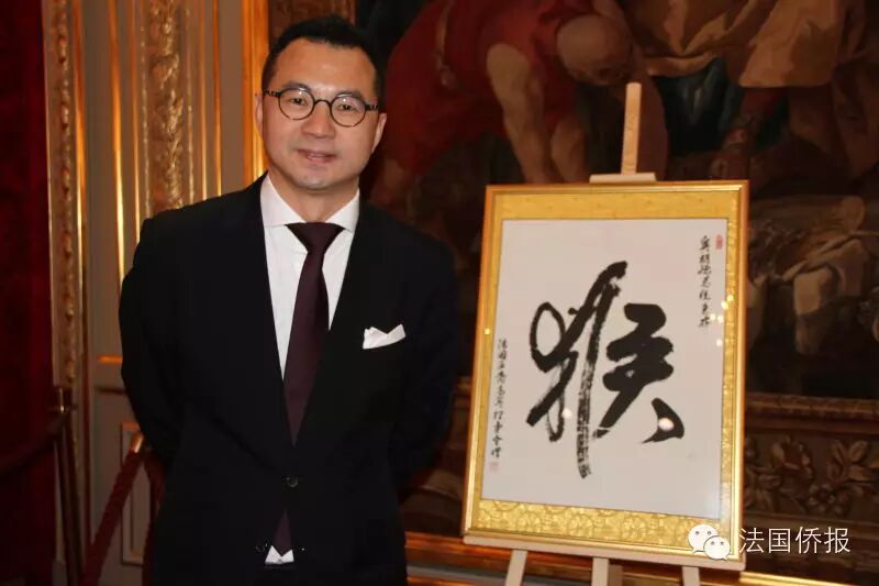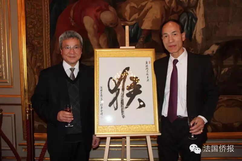 当天,陈文雄议员代表亚裔族群向总统府赠送了由华裔艺术家叶星千的墨宝“猴”字,奥朗德与众嘉宾纷纷与汉字“猴”合影留念,开启幸福美好的猴年。