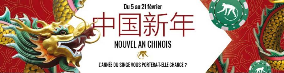Voyagez au plein cœur de la Chine et découvrez tout l’univers de ce pays à travers toutes les festivités du Nouvel An Chinois. Casino Enghien vous attend du 5 au 21 février pour une nouvelle année placée sous le signe du Singe et de la chance !