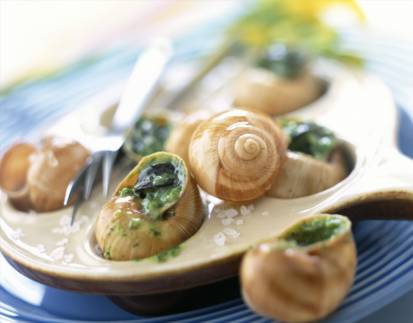L'escargot, logé au fond de la coquille, est recouvert de beurre additionné de persil haché et d’ail pilé, puis passé au four.置于壳中的蜗牛,浇以黄油和蒜泥,黄油中还加了剁碎了的香芹,然后放进炉子里。
