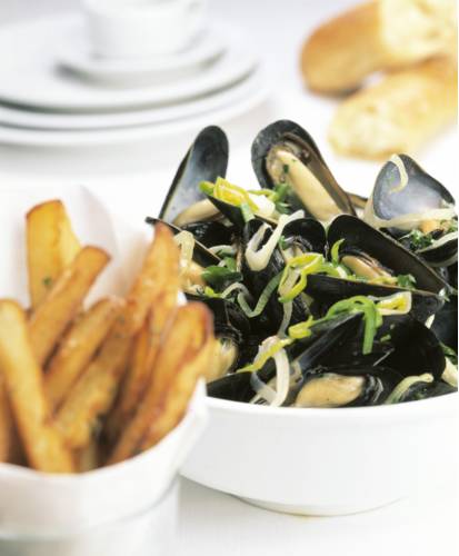 Le moules-frites est un plat très populaire en Belgique et dans le nord de la France. C’est un mets simple constitué de moules cuites et assorties de frites.蓝青口薯条是在比利时和法国北部非常流行的一道菜。这是一道简单的菜肴,由煮熟的贻贝和薯条搭配而成。