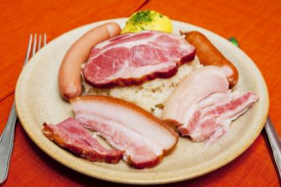 La choucroute est un plat composé de chou coupé finement, pommes de terre, saucisses, lard fumé et/ou salés, clous de girofle, oignon, gousse d’ail, vin blanc sec.腌酸菜是一道由切碎的卷心菜,土豆,小红肠,烟熏或盐渍的肥猪肉,丁香,蒜瓣儿和干白烹调而成的菜肴。