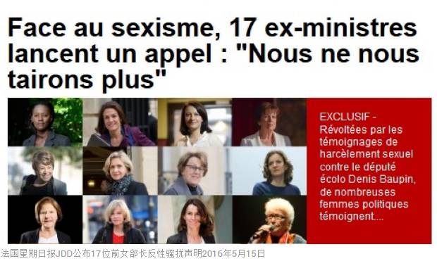 本报讯:昨日5月15日法国《星期日报》刊出17名法国前任女部长联署声明。这17位法国女政治人物表示,面对性歧视和性骚扰“我们不再沉默”。