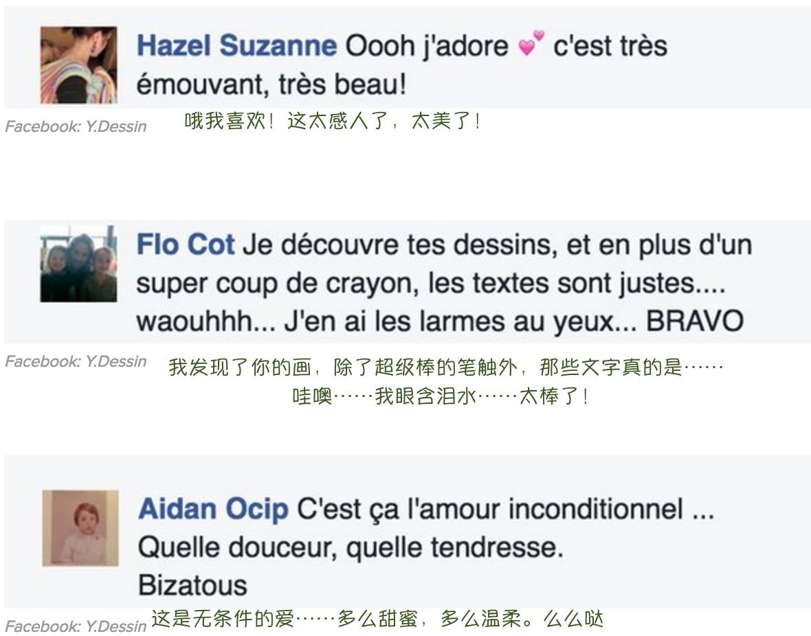 这些发布在脸书上的插画得到了上千的赞和分享,似乎这些画深深感动了大家。当别人问他希望这些画会启发人们什么时,Yannick Vicente说:“我希望看到许多积极的信息和爱的信息,这是当我画这些画时所感受到的。”即使他女儿现在还不能完全理解这些故事,这位法国插画家希望女儿有一天能懂。 他说,“我希望我女儿能看到这些画,当她长大到能够理解我在里面写的东西”。