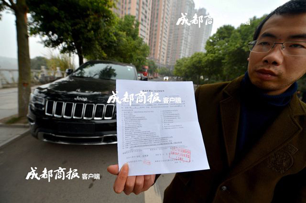 11月28日,直到《机动车登记业务告知书》下发到手,刘先生才肯相信:自己花了55万新买的进口JEEP车无法上牌。成都市公安局交警支队车辆管理所给出理由更让他难以接受:“该车车辆识别代号为8.12天津爆炸事故涉及车辆,不能办理注册登记”。