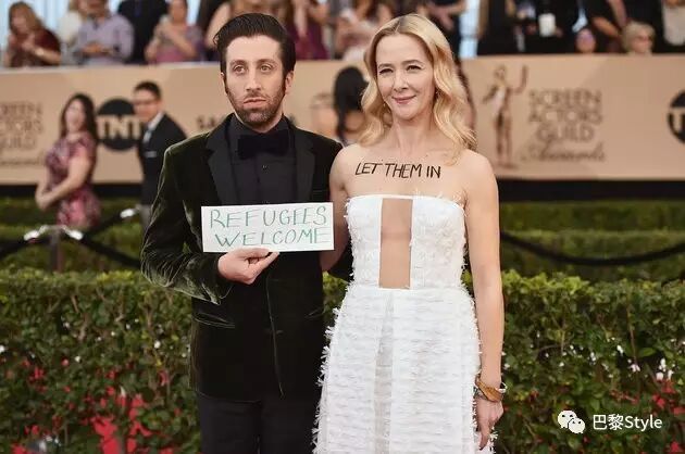 在颁奖礼前的红毯秀环节,就已闻到了“火药味”。美剧《生活大爆炸》演员西蒙·赫尔伯格举起“欢迎难民”的标语,以抗议特朗普27日签署的一项行政令。