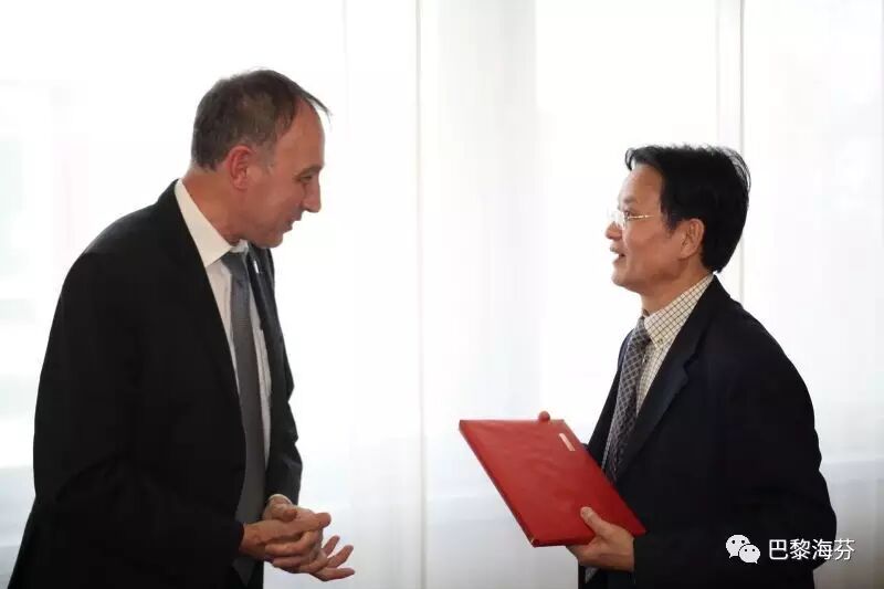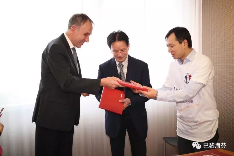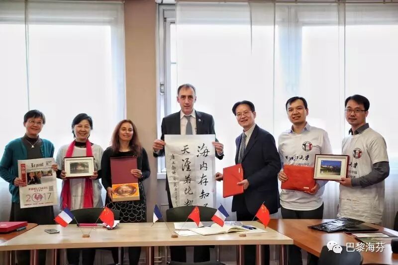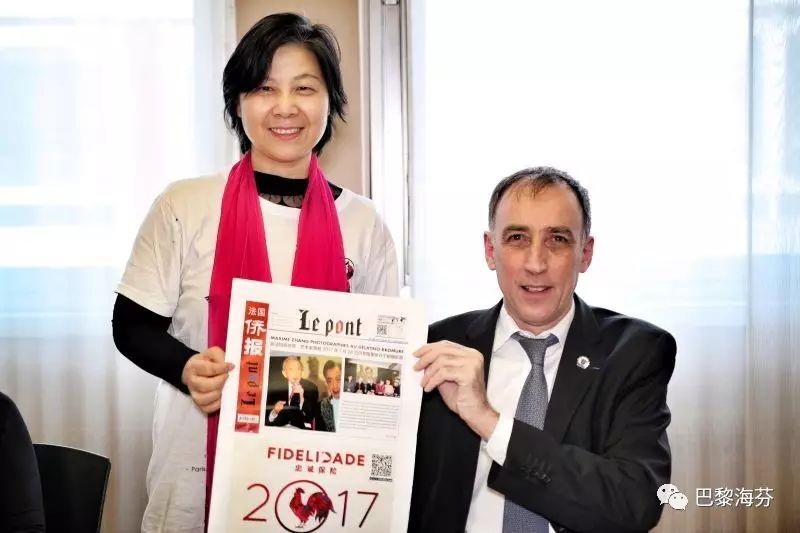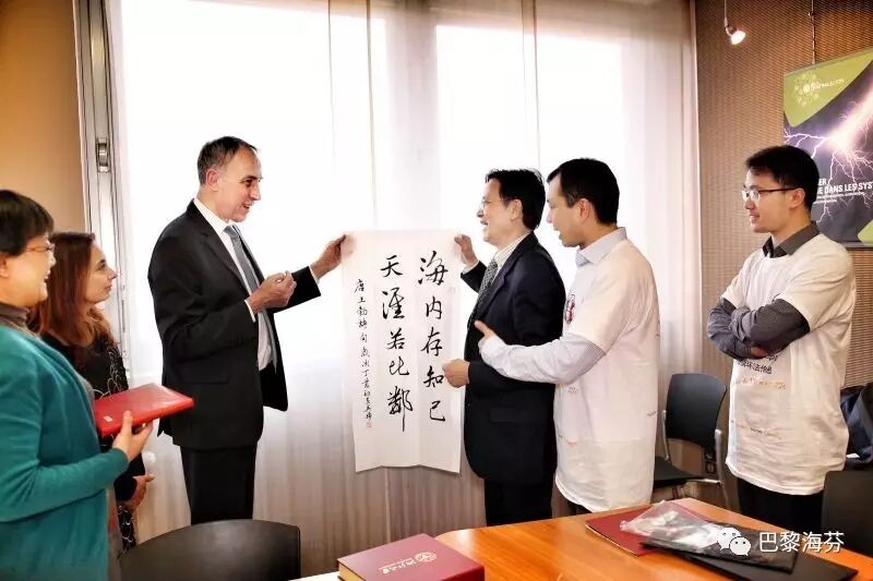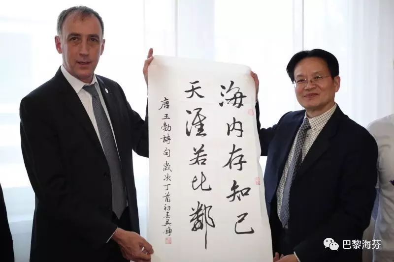尤其是,吴铮现场赠送给富朗克校长亲书的书法“海内存知己,天涯若比邻”,当我们用法语解释过意思后,富朗克连连说:我今天真的很感动很感动!我要回去马上把这份中国艺术挂起来欣赏!《法国侨报》社长也带去了2017年新出版的铜版纸印刷的精美报纸。当富朗克看到头版就是法兰西院士程抱一时,情不自禁发出“哇”的赞美声!当听钱海芬介绍说,这是法国目前华人创办的唯一的双语报时,富朗克说:我要才抽空好好拜读!