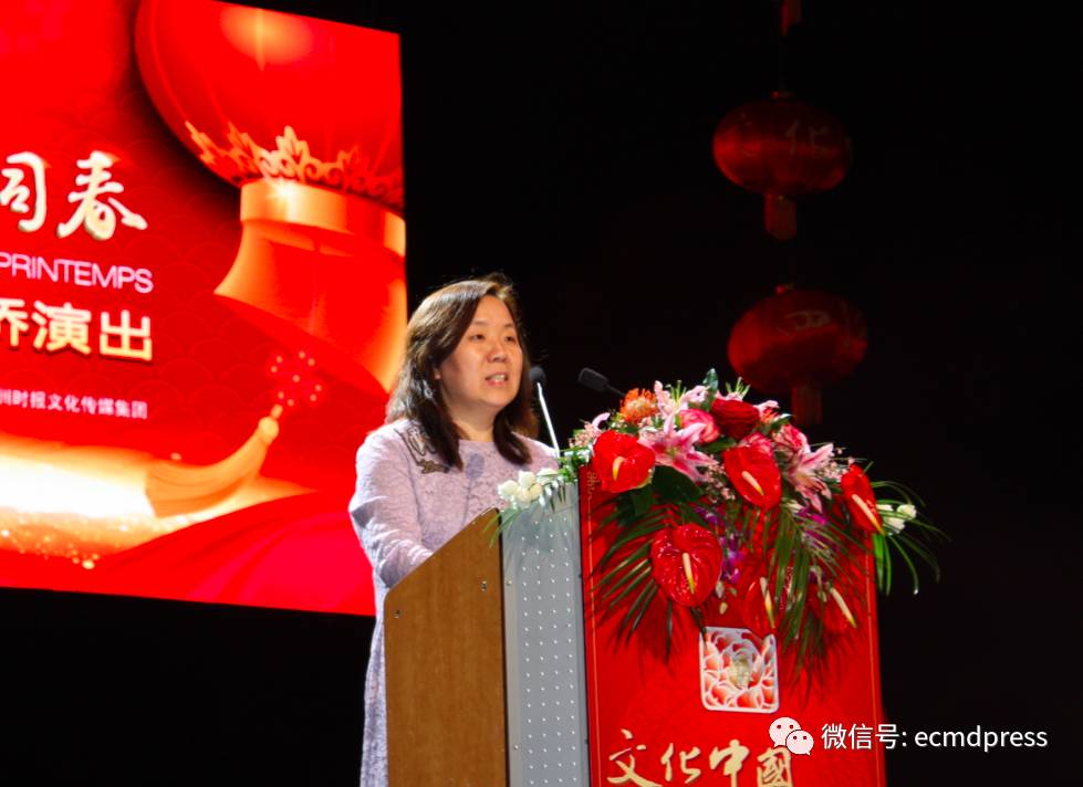 李国红团长登台发表了热情洋溢的讲话。作为国务院侨办副司长的她,诚挚地为法国华侨华人送上了美好的新春祝福!她说,春节是中华民族最隆重热烈的节日,蕴含了海外华侨华人对团圆、喜庆、和平、幸福的美好期盼!