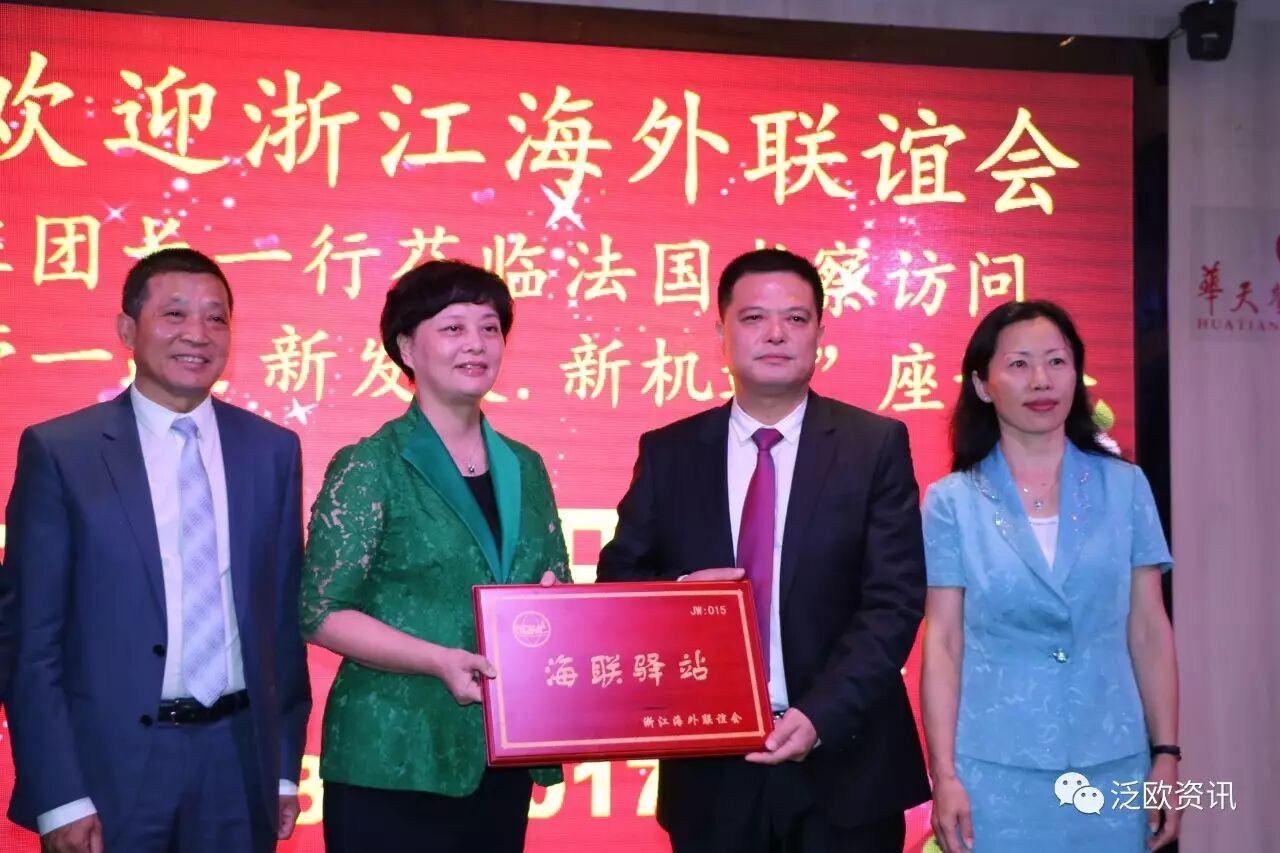 20:55分,金长征团长给法国华侨华人会主席任俐敏授予了“海联驿站”匾牌。