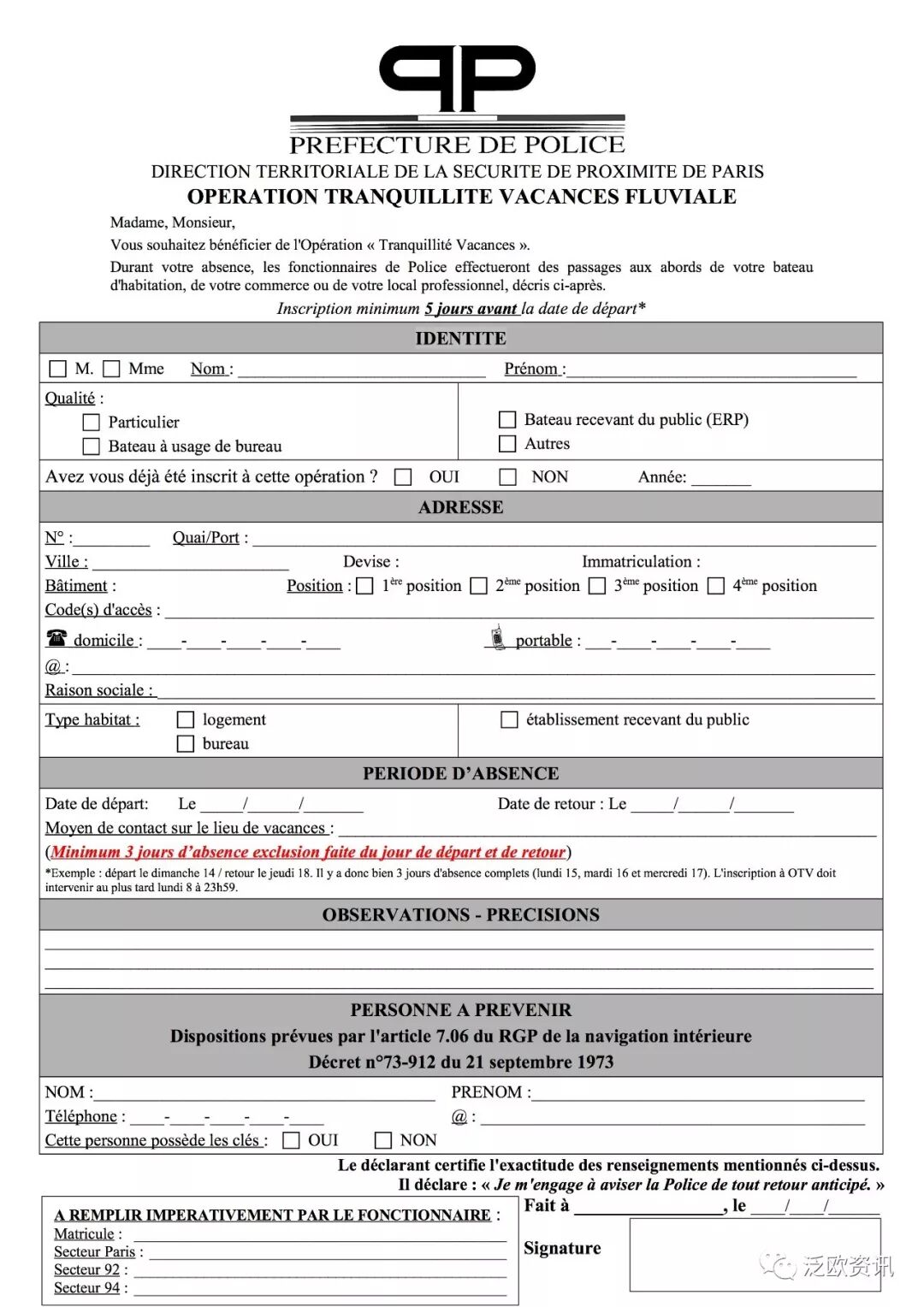 点击标有OTV的链接并下载填写表格。在您出发前5日,把填完的表单、您的身份证复印件以及一份住宅证明(EDF或者GDF账单)同时提交给您附近的警察局。