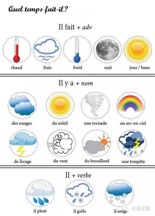 据说世界上的大部分聊天都是从聊天气开始的 Quel temps fait-il ? Il fait bon Il fait mauvais Il fait frais Il fait froid Il fait chaud Il fait nuageux Il fait beau Il fait doux Il fait orageux Il fait soleil Il fait humide Il fait lourd Il fait du vent Il fait du brouillard Il neige Il pleut Il gèle Il grêle Il fait ____ degrés Il pleut des cordes Il caille Ça caille 【天气】 Il fait beau 阳光明媚 Il pleut 下雨 Il neige 下雪 Il fait chaud 天热 Il fait froid 天冷 Il fait du vent 刮风 Il fait sec 天气干燥 Il fait clair 天气晴朗 Il fait humide 天气潮湿 Il fait mauvais 天气糟糕 Il y a de l’orage 暴风雨 据法语法国 |