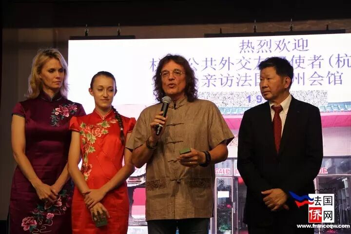 周震团长说:这是一次宣传美丽杭州,推广诗意江南的国际活动。杭州使者们带来了家乡杭州的邀请函,也传递来自杭州市政协以及杭州市旅委的热情,他恭请诸位朋友有空去杭州走走看看,深度体验家乡杭州的种种变化。他还说,十三世纪,大旅行家马可.波罗把杭州的故事带给欧洲,讲给世界。几十年来,杭州商界人士又把中国商品及东方优雅带到欧洲和全世界。他希望,他们能将杭州的幸福快乐传递给世界各地的友人,并祝愿中法友谊长存。