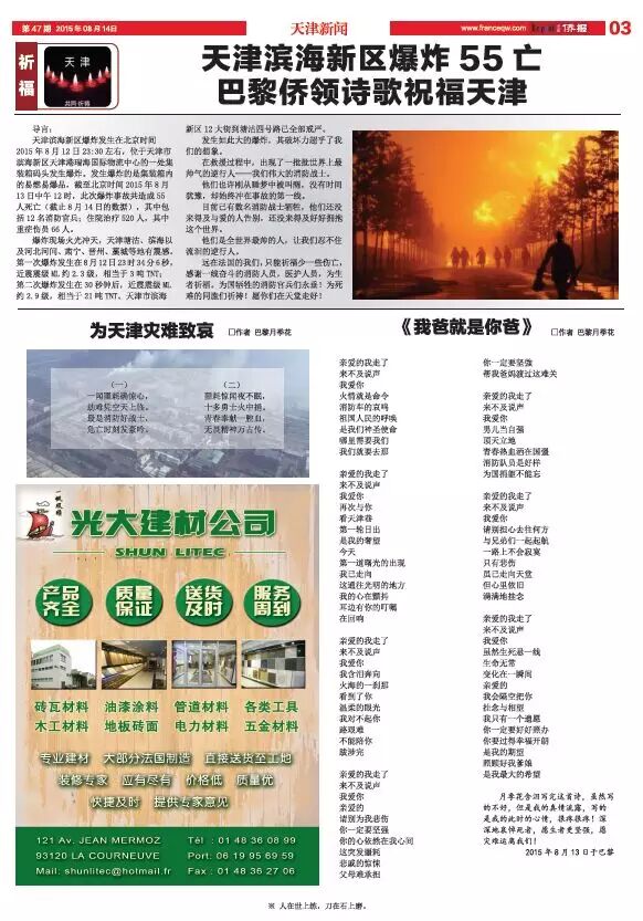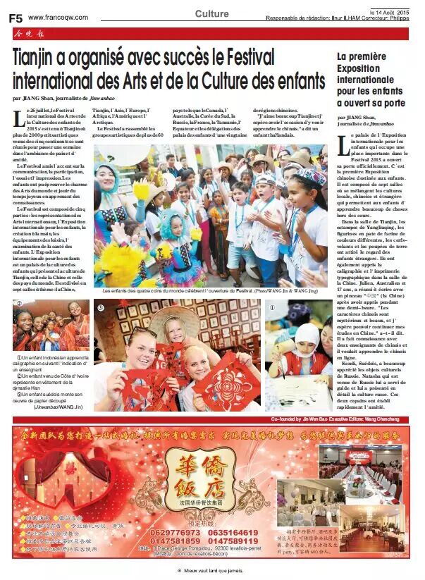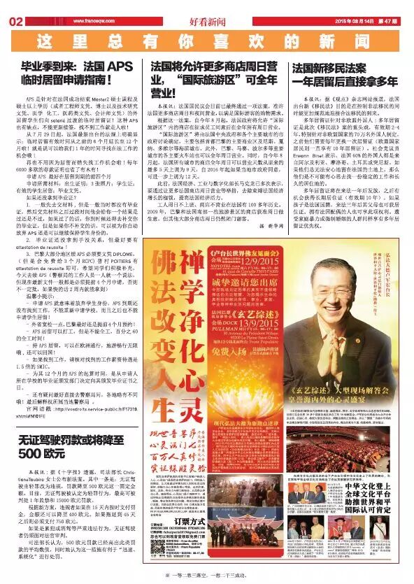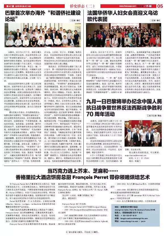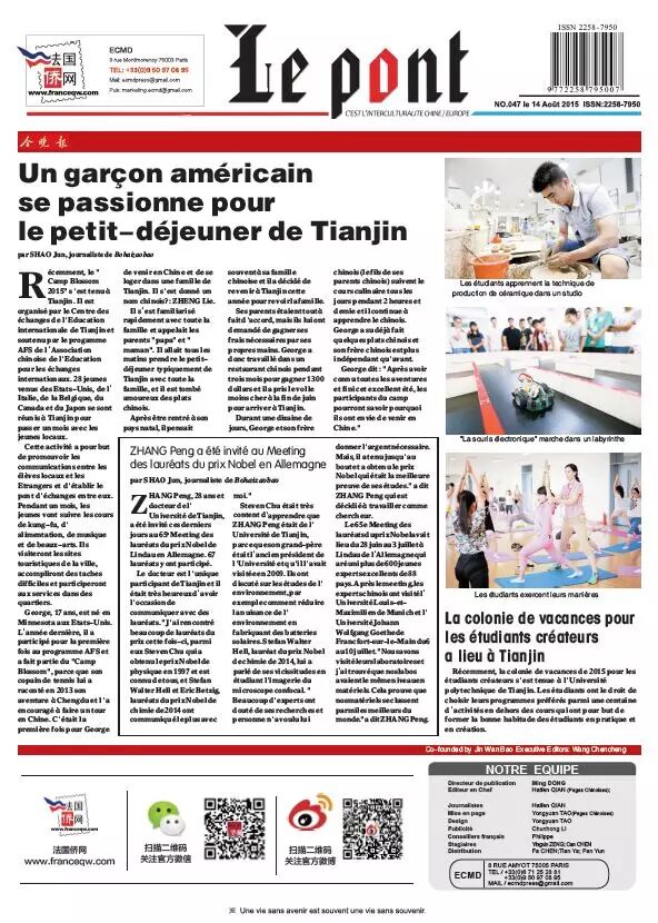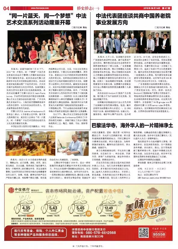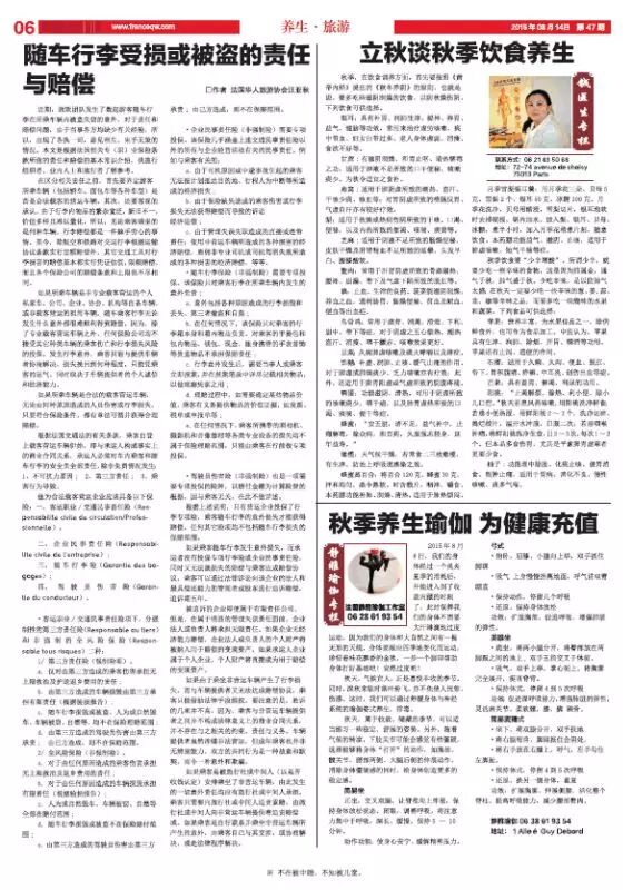 《法国侨报》第47期 精彩内容抢先看! 想知道,树欲静而风不止,子欲养而亲不在的亲身感受吗?请看:(绝对原创)昵娘,让我再为你洗一次澡!——法国钱海芬专栏; 想知道在法国,(旅游)随车行李受损或被盗的责任与赔偿吗? 还有:(瑜伽)立秋养生瑜伽 为健康充值——静雅专栏 (健康)立秋谈秋季饮食养生——钱医生专栏 【侨讯】巴黎首次举办海外“和谐侨社建设论坛” 【侨讯】法国华侨华人妇女会喜迎义乌访欧代表团 (电商)心怀感恩超越梦想--杭州炎夏目击意大利你好集团海内外跨境电商团队月会; 巴黎侨领月季花诗歌祝福天津(配大幅震撼图片) 为天津灾难致哀 更多精彩内容……法国侨报最新一期先睹为快! 法语版《Le Pont》,不容错过! |