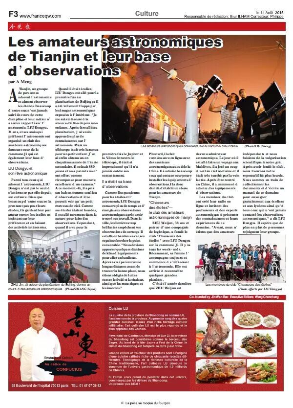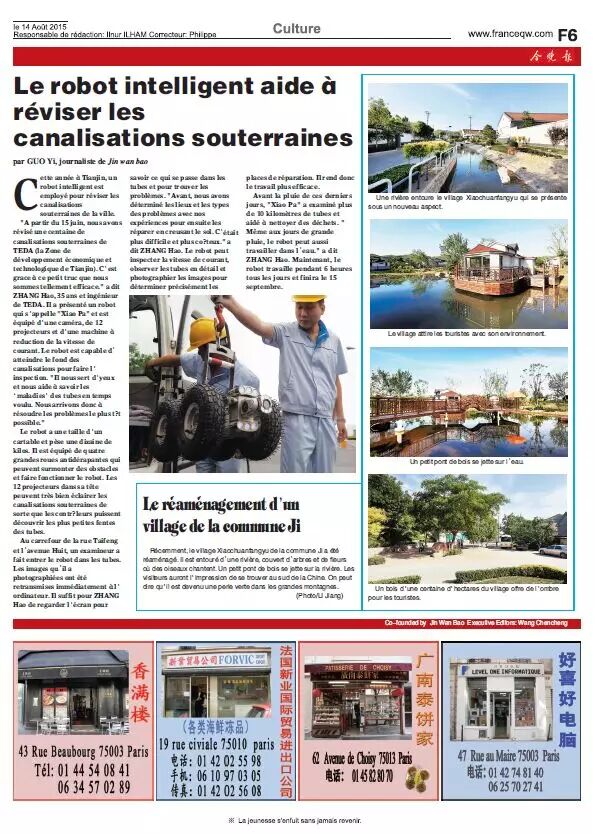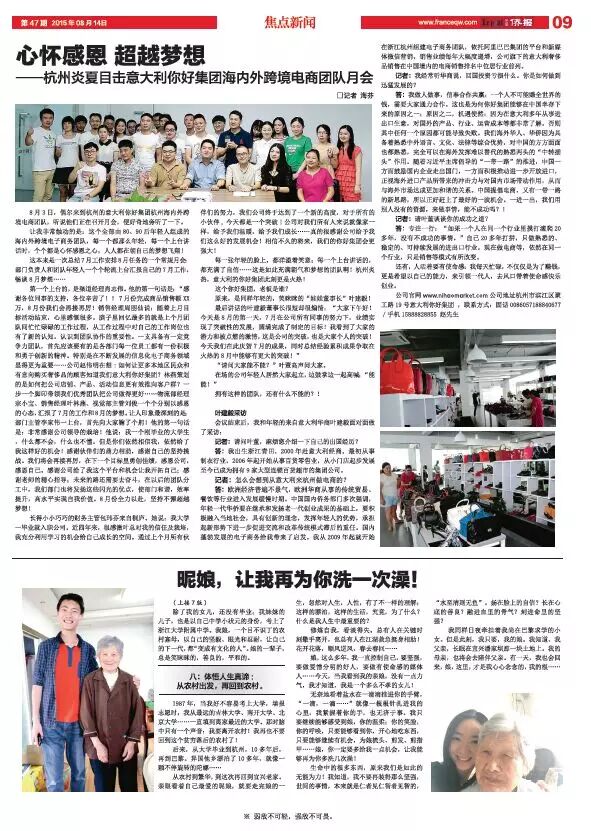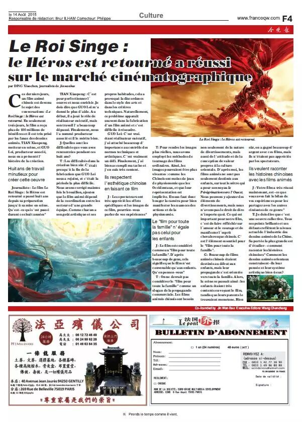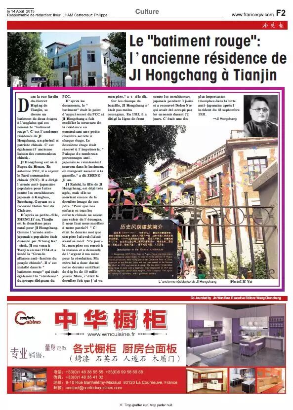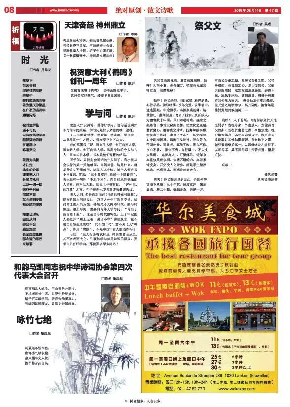 《法国侨报》第47期 精彩内容抢先看! 想知道,树欲静而风不止,子欲养而亲不在的亲身感受吗?请看:(绝对原创)昵娘,让我再为你洗一次澡!——法国钱海芬专栏; 想知道在法国,(旅游)随车行李受损或被盗的责任与赔偿吗? 还有:(瑜伽)立秋养生瑜伽 为健康充值——静雅专栏 (健康)立秋谈秋季饮食养生——钱医生专栏 【侨讯】巴黎首次举办海外“和谐侨社建设论坛” 【侨讯】法国华侨华人妇女会喜迎义乌访欧代表团 (电商)心怀感恩超越梦想--杭州炎夏目击意大利你好集团海内外跨境电商团队月会; 巴黎侨领月季花诗歌祝福天津(配大幅震撼图片) 为天津灾难致哀 更多精彩内容……法国侨报最新一期先睹为快! 法语版《Le Pont》,不容错过! |