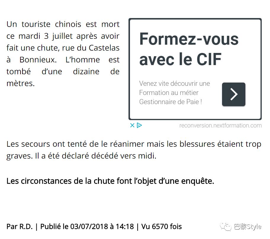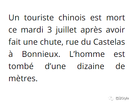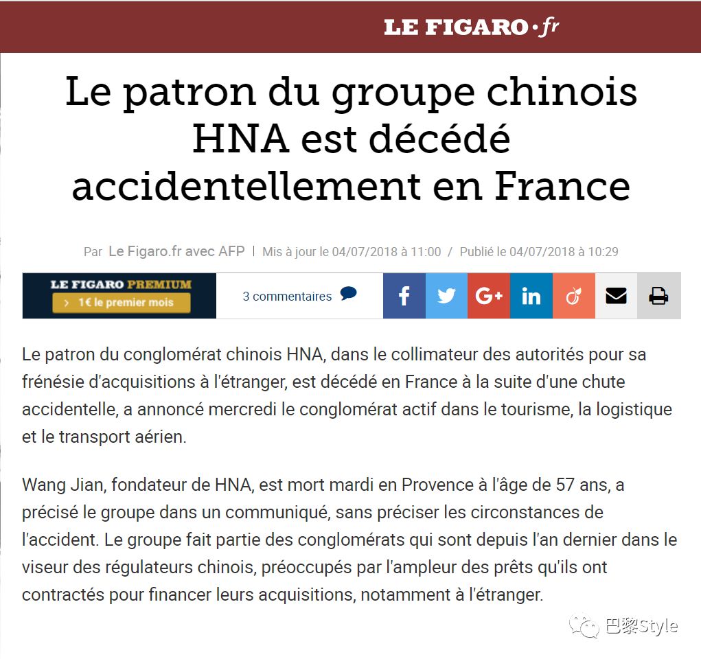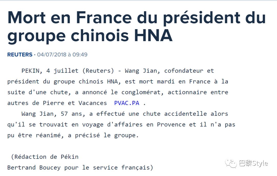 (《法国侨报》紧急报道组: 海芬+33 0671252881、佳宁+33 0630630262、小马+33 0658656390) 法国当地媒体说:“一名中国游客在当地时间7月3日,从10多米高的地方坠落死亡。”(Un touriste chinoisest mort ce mardi 3 juillet après avoir fait une chute, rue du Castelas àBonnieux. L’homme est tombé d’une dizaine de mètres.) 后来发现,法媒的这位“中国游客”就是海航集团联合创始人王健。 法国主流媒体全部关注海航集团联合创始人王健去世信息:费加罗报、世界报…… 连路透社也专门发文…… 海航集团联合创始人王健在法国哪里摔下来的? 普罗旺斯的阿维尼翁。 怎么去世的? 《LA PROVENCE》(普罗旺斯报)报道,当天(七月三日)上午接近11点,在 Bonnieux的Castelas 街,一中国男子在教堂附近台阶上拍照时,从高处掉落,不治身亡。 法媒说:王健是去法国参加一个公务活动,期间休息时到普罗旺斯的阿维尼翁游览,不慎从一个十几米高的地方摔下,当场昏倒,随即被送往医院抢救,抢救过程中只对医生说了一句“脚疼”,之后未能抢救过来…… 海航集团董事局主席陈峰已飞往法国。 其他在外的海航高管正赶回公司总部三亚。 陈峰现任海航集团董事局主席,是海航的主要开创者。1984年毕业于联邦德国汉莎航空运输管理学院;1995年获得荷兰马斯特里赫特管理学院工商管理硕士学位;2004年获得美国哈佛大学商学院高级管理毕业证书。曾在联邦德国汉莎航空运输管理培训中心学习。