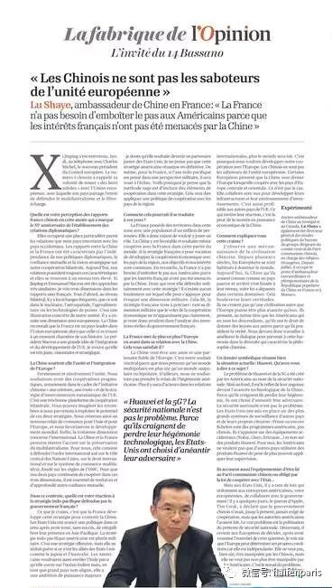 2019年12月11日,法国主流媒体《言论报》刊登对驻法国大使卢沙野的采访,议题涉及中法关系、法国“印太战略”、中法第三方市场合作、中欧关系、香港局势、新疆问题、华为与5G等。访问实录全文如下: 问:您如何看待建交55年来的中法关系?如何推动中法关系不断改善和发展? 答:中法关系在中欧关系中有显著特色。因为法国是最早与中国建交的西方国家之一。在东西方冷战的背景下,这一决定凸显毛泽东主席和戴高乐总统等两国领导人的战略眼光和坚定决心。外交政策独立、相互信任、双边合作具有战略性等中法关系的特性,一直延续到现在。正因此,建交55年来,中法关系发展顺利,甚至成为中国与西方国家中最好的一组双边关系。习近平主席和马克龙总统在许多领域都有着相似的看法。在两国元首引领下,当前中法关系达到历史上很高水平。我认为中法关系包涵三个层面: 一是双边层面,两国领导人互访频繁,有力促进了两国友好合作关系。2018年初,马克龙总统首次对华进行国事访问。今年11月,他再次对华进行国事访问并出席第二届中国国际进口博览会。他对中国和中国的发展很感兴趣,表示每年都要访华。习近平主席5年前首次对法国事访问,今年再次正式访法,相信今后还将继续来法访问。两国元首的直接交流与接触十分重要。 务实合作是促进双边关系和友谊的经济支柱。我们的友谊不是抽象的,而是具体的,体现在两国合作的丰硕成果上,领域涵盖民用核能、航空航天、农食、高端技术等。相互投资方面,法国在中国有大量投资,中国在法国也有大量投资。近年来中国在法投资方面有很好案例,比如中国复星集团收购地中海俱乐部就很成功。这只是诸多案例之一。几天前我出席了由巴黎大区工商会法中交流委员会举办的研讨会。会上,曾赴上海参加第二届中国进博会的法国企业家们讲述了他们与中国伙伴开展良好合作的经历。 人文交流十分重要,为促进两国人民友谊打下坚实基础。我来到法国后,发现该领域合作成果喜人。目前有近一万法国学生在中国留学,在法国有4万多名中国留学生。两国各有10万人学习对方语言。在法国有18所孔子学院教授汉语和中国文化。法语联盟在中国开设约15家机构,传播法语和法国文化。这样,两国民众能更好地相互了解和理解。此外,两国地方合作活跃。我多次赴外省访问,每次都被地方政府和民众对与中国合作的热情所感动。 二是中欧层面。法国在欧盟发挥着关键引领作用,特别是当前欧盟发展处于十字路口。马克龙总统对欧盟一体化和发展有很多正确的、具有战略眼光的想法。中方真诚、坚定地支持欧盟团结和一体化,希望在经济、社会、文化等领域同欧盟开展务实合作。特别是“一带一路”倡议与欧盟“欧亚互联互通战略”对接,这是中欧间合作的良好平台,有利于促进双方发展。通过二者对接挖掘亚欧大陆国家潜力,不仅将为亚洲和欧洲带来新的增长点,也将刺激世界经济增长。 三是国际层面,两国共同维护多边主义。中方认为,多边主义就是维护以联合国为核心、以国际法为基础的国际体系和以世界贸易组织规则为基础的多边贸易体制。这是我们的基本立场。当然我们还有其他多边主义原则,如通过对话和协商解决国际争端和冲突。对此,中国与法国和欧盟都有十分相近的立场,可以加强合作。 要实现以上三个层面的良好合作,重点是加强和深化互信。我注意到欧洲人对中国表现出不信任。特别是中国经济实力的上升令欧洲人害怕。为什么会害怕?我一直在想这个问题,但尚未找到答案。也许双方存在文化差异。但无论如何,我愿与法国人、欧洲人多沟通,更好地理解他们;同时多介绍中国,使他们能理解中国。这是我在法国的工作。 问:您谈得很好,这是一种对中法关系和中欧关系的乐观看法。双方是否也存在棘手问题?如法国与美国及其他国家一起推动“印太轴心”,这一战略显然旨在遏制中国。您如何评价“印太轴心”和法国在其中发挥的作用? 答:确实,我担心法国推行旨在遏制中国的印太战略。因为美国提出印太战略主要为抗衡中国。此前,美国曾实施亚太再平衡战略,但没有成功。中国继续发展并与亚太地区邻国开展合作。我认为美国的印太战略主要在军事层面,缺少经济合作和文化元素。这是个不友好的进攻性战略,很少有国家欢迎。在亚太地区,只有日本、澳大利亚等美国少数盟友加入该战略。他们也邀请印度加入,以涵盖印度洋地区。但印度有不结盟传统,有成为重要大国的雄心,恐怕不太可能甘心成为美国的附庸和小伙计。因此,我认为美国的印太战略不会成功。对法国而言一样,如印太轴心服务于军事目的,必将失败。聪明的做法是把合作融入这一战略,即实施与地区国家合作战略。法国在该地区有海外领地和100万人口,可以在该地区发挥作用,和印度、东南亚国家联盟成员国等进行合作。这很正常,中方对此表示赞同,甚至希望可以在该地区同法方合作。如“一带一路”倡议中就有“21世纪海上丝绸之路”,我们可在此框架内合作。如果法国印太战略是以发展同地区国家经济合作为宗旨,我们的目标是一致的。 问:但目前,您是否感到法国有这方面的合作意愿,还是法国存在对中国的担忧和警惕,坚持维持现有秩序,不愿改变? 答:我想法国不需要追随美国,因为法国的利益没有被