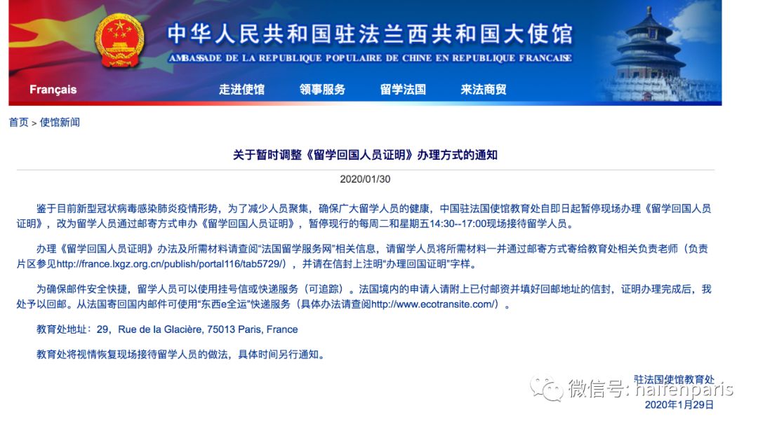 《法国侨报》讯:记者从中国驻法大使馆教育处网站上获悉:教育处暂停现场办理《留学回国人员证明》改为邮寄方式申办! 全文如下: 鉴于目前新型冠状病毒感染肺炎疫情形势,为了减少人员聚集,确保广大留学人员的健康,中国驻法国使馆教育处自即日起暂停现场办理《留学回国人员证明》,改为留学人员通过邮寄方式申办《留学回国人员证明》,暂停现行的每周二和星期五14:30--17:00现场接待留学人员。 办理《留学回国人员证明》办法及所需材料请查阅“法国留学服务网”相关信息,请留学人员将所需材料一并通过邮寄方式寄给教育处相关负责老师(负责片区参见http://france.lxgz.org.cn/publish/portal116/tab5729/),并请在信封上注明“办理回国证明”字样。 为确保邮件安全快捷,留学人员可以使用挂号信或快递服务(可追踪)。法国境内的申请人请附上已付邮资并填好回邮地址的信封,证明办理完成后,我处予以回邮。从法国寄回国内邮件可使用“东西e全运”快递服务(具体办法请查阅http://www.ecotransite.com/)。 教育处地址:29,Ruede la Glacière, 75013 Paris, France 教育处将视情恢复现场接待留学人员的做法,具体时间另行通知。 (来源:中国驻法大使馆教育处 http://www.amb-chine.fr/chn/sgxw/t1737597.htm) 推广 |