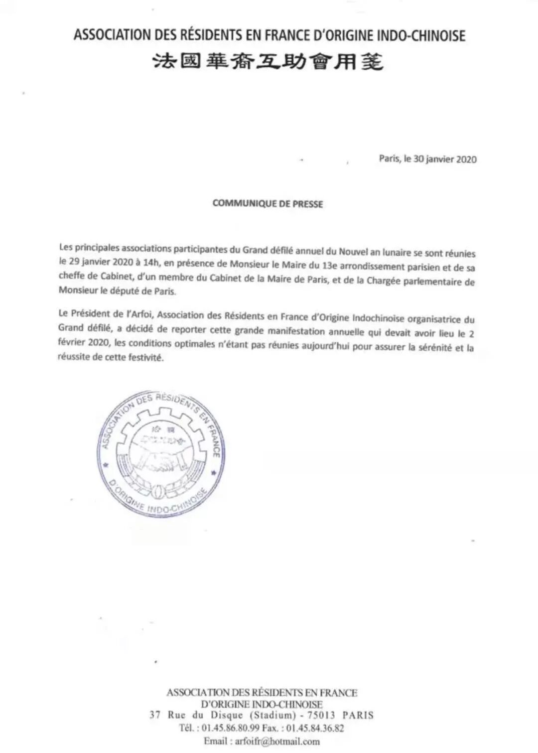 《法国侨报》讯:(记者 小瓦)法国华裔互助会取消原定于2月2日的春节游行活动。