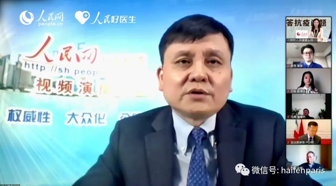 早早就架起三脚架,在两个手机上边看边拍需要的画面…… 主持人简单开场白后,中国驻法国大使馆卢沙野大使致辞后,从法国华侨华人会主席任俐敏(法国潮州会馆第一常务副会长许葵共两位侨界代表)开始,法国的几位来自侨界、留学生等代表纷纷开始就大家关系的问题进行提问。以下是摘选 张文宏教授重要语录: 任俐敏问:法国医院目前只收重症患者,轻症患者居家隔离期间如何治疗? 张文宏教授答:居家隔离时遇到最大的问题是心理问题,“非常恐惧,感觉得了这个病和世界末日一样。” 他认为,80%的人不需要去医院就诊。60岁以内的人都是年轻人,95%的年轻人目前得病率很低。只要做好三件事就够: 第一,心态要好; 第二,好好睡觉; 第三,吃好喝好。 那么自己觉得不舒服,何时可以打15急救电话?急救电话不来怎么办? 张文宏教授强调:有一种情况需要去医院——有明显的肺部损害,即表现为力气不够。“做一点点家务事,就觉得力气不够了。这个信号是很明确的,要立即就诊,接受氧气治疗。” 那如果自己觉得出现症状,第一个电话打给家庭医生了。但是没人接怎么办? 祖国的医生会理你!(确实,目前法国也有好些远程诊疗群,每天都在帮大家义诊;旅法侨界大联合,纷纷在义务处理、送药甚至给隔离的同胞送饭等。需要的朋友可以随时联系他们。这些都是巴黎新冠病毒下最无私的英雄!附图)