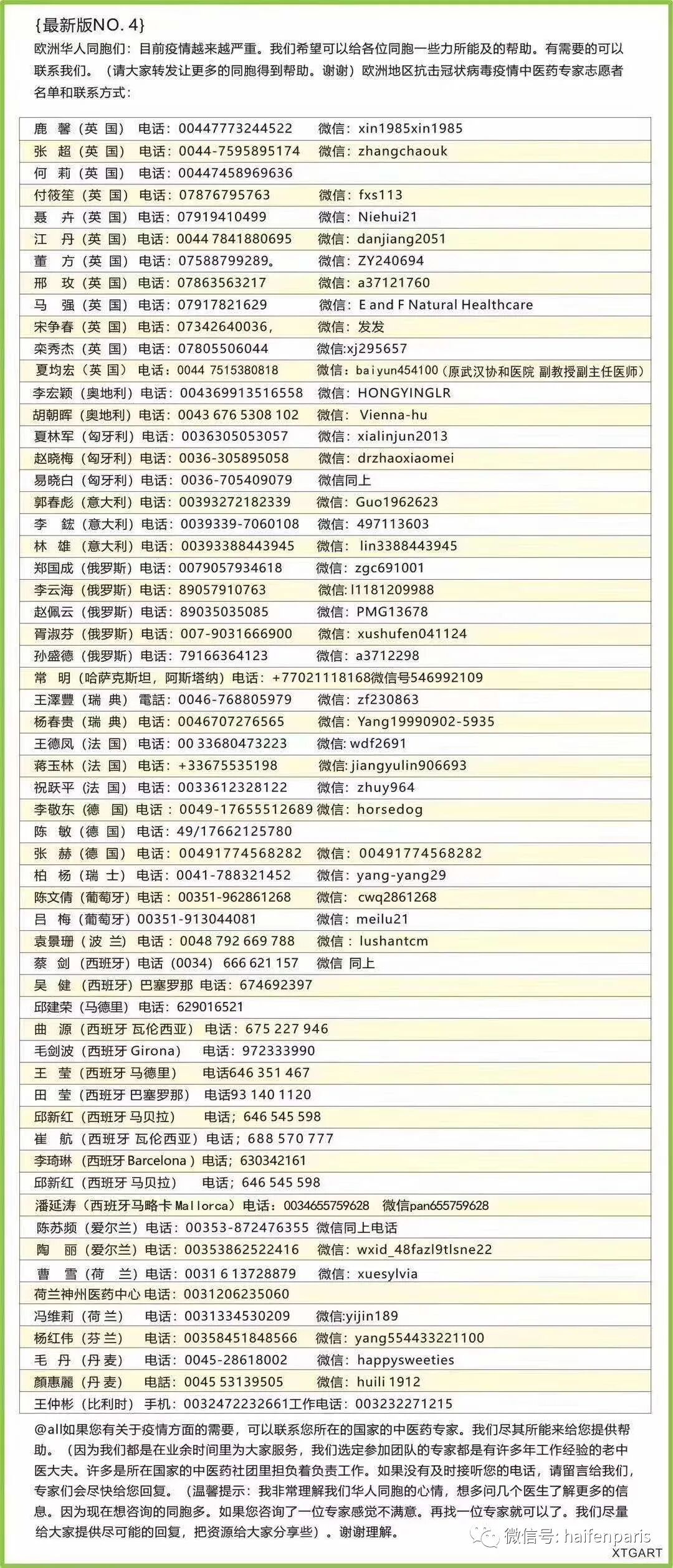 再谈一下法国目前远程义诊群的一个提醒: 为应对疫情,特为同胞志愿义诊。凡有以下症状的,可获义诊:1、发热温度:夜间发热:2、咳嗽,干咳,有痰,颜色3、咽痛:4、腹泻:5、乏力:6、呼吸困难,气喘7、怕冷,怕风8、头晕头痛9、恶心呕吐10、嗅觉、味觉是否丧失?11、是否全身酸痛、项强。12、其它急症。因要集中精力应对疫情,其他慢性病症原则上暂不接收,希望同胞们理解。 实用欧洲救助团队医护名单 中国海外同胞紧急救助信息:如有中国同胞在海外确诊新冠病例或者疑似病例,遇到当地医院不接收治疗的情况,请不要恐慌,即刻与驻守当地的救助团队联系,他们代表祖国愿意为您提供救治及必要的帮助。下面是欧洲各国的救助团队医护名单,如需要帮助请联系名单中任何一位医生。