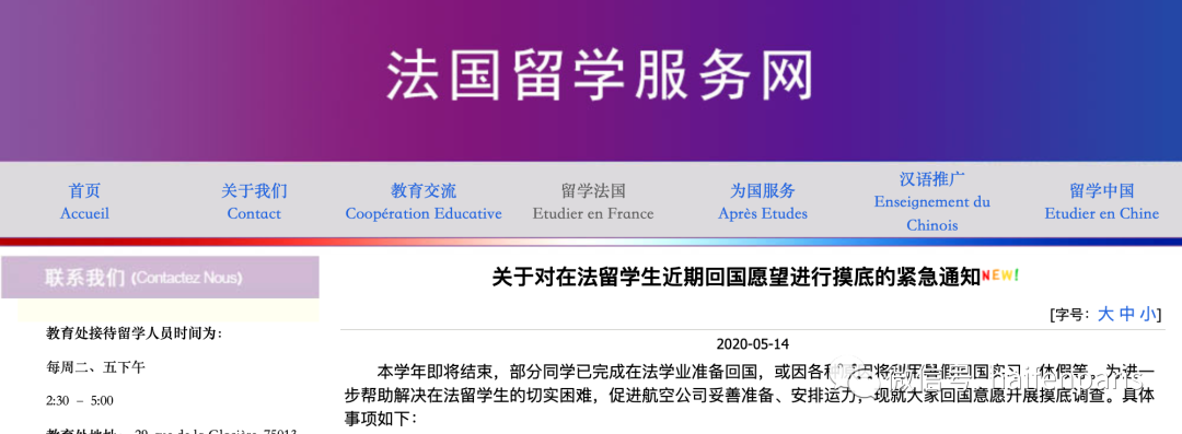 《法国侨报》讯:昨日,法国留学服务网发出对在法留学生近期回国愿望进行摸底的紧急通知。全文如下: 本学年即将结束,部分同学已完成在法学业准备回国,或因各种原因将利用暑假回国实习、休假等。为进一步帮助解决在法留学生的切实困难,促进航空公司妥善准备、安排运力,现就大家回国意愿开展摸底调查。具体事项如下: 一、请确需回国留学生通过下方链接填写调查问卷,截止时间为2020年5月20日中午12:00(巴黎时间)。 二、将根据调查问卷内容结合困难程度、年幼优先等原则生成名单。航空公司根据提供的名单按序进行呼叫,多次呼叫未接听或未在规定时间内完成购票,即视为放弃本次乘机。请务必保持手机畅通。 三、航班机票和回国隔离费用自理。 四、法国目前边境仍未开放,短期内可能无法返法。建议根据学业需要仔细评估,慎重决定。 五、出票人员严格按照大使馆微信公众号“防疫健康国际版程序更新的通知”(https://mp.weixin.qq.com/s/2galYmLoru4MrxIRkX_qBg),连续填报天数不足或健康状况异常将无法登机,虚假填报需承担相应法律责任。 六、自觉接受乘机过程及抵达目的地后的各项检疫、防控安排。 七、使馆未委托任何个人或机构组织登记或调查,使领馆工作人员也不会直接联系个人要求付款,亦不会要求支付订金或押金,请大家提高警惕。接到航空公司电话后,请前往其官方网站付款平台支付票款。 调查问卷连接:https://www.wjx.cn/jq/77067357.aspx 联系电话: 0144081940,0773197069(工作日) 0637575145(非工作时间及周末节假日) (来源:驻法使馆教育处) 推广: |